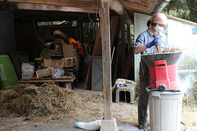 ここでは新しい田んぼの土と裂いた藁をみんなで混ぜているこれを8月まで被せて発酵させる藁が分解され溶け出たリグニンが