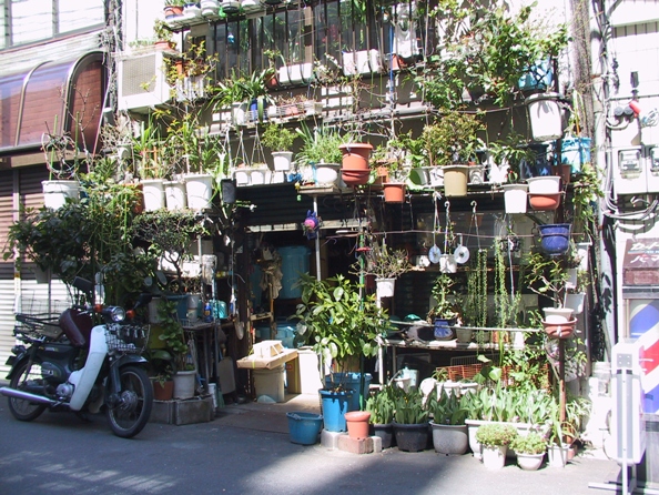 Its common to see planted pots jam-packed in residential neighborhoods of Tokyo.東京で良く見かける鉢植えの集まり。(写真はhttp://blog.goo.ne.jp/yamaneko4989/e/cc9b40617e27631f307cdeb11dec0e74より)