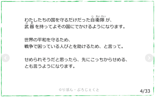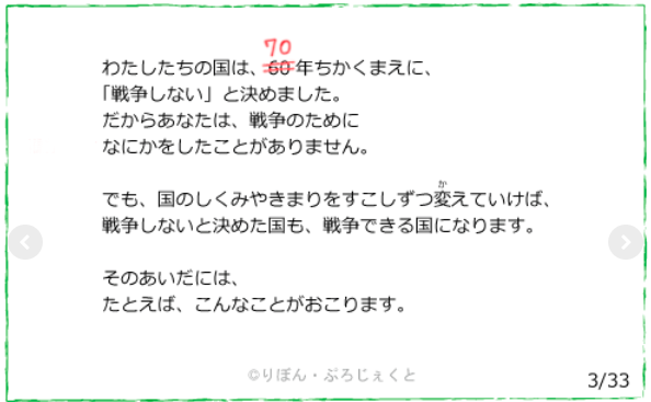それでも、まだ道は残されています。私たちが気づき、変えていくことの出来る未来がきっとあります。この国を愛するひとりでも多くの人たちが、「戦争をしない未来を選びとる」ことを、私たちは願ってやみません。