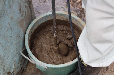 田んぼの土を水と混ぜて網に通しているところ石とか不純物を取り除いている