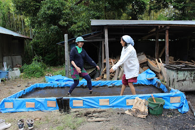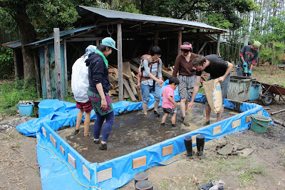 ここでは新しい田んぼの土と裂いた藁をみんなで混ぜているこれを8月まで被せて発酵させる藁が分解され溶け出たリグニンが
