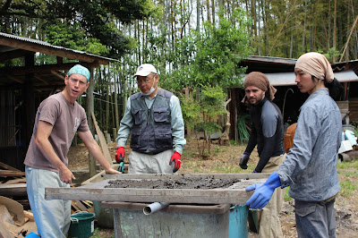 パンツいっちょうの僕とたまたま来た日本でモデルをしている子と伝説のゆりこさんで材料を混ぜているところ材料:粘土、藁、砂、馬糞、牛糞、小麦粉、水