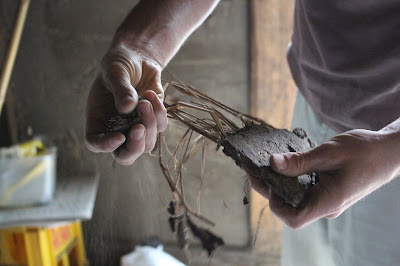 藁を細かく裂いているところ多分、この方が粘土によく混ざって強度も増すんだと思う