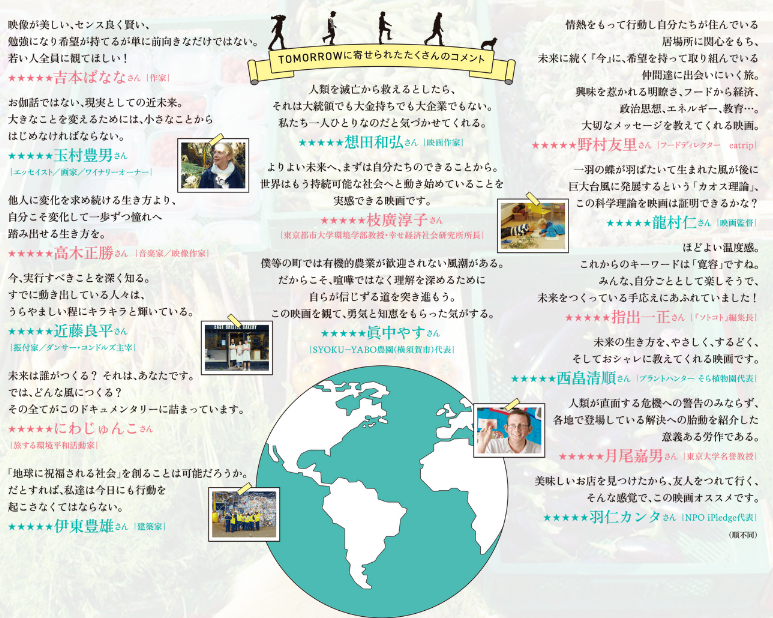 みんなに映画 【TOMORROW パーマネントライフを探して】をぜひ見て欲しい。問題意識もとても素敵な感じでまとめていて、(欧米中心ではあるけど)「答え」を実践している数多くの人の魅力的な取り組みが分かりやすく紹介されている。個人だけではない、コミュニティーとしてできること。社会として始まっている、人間が地球で生き続けるための取り組み。別に、問題意識がなくても楽しそうな生き方。